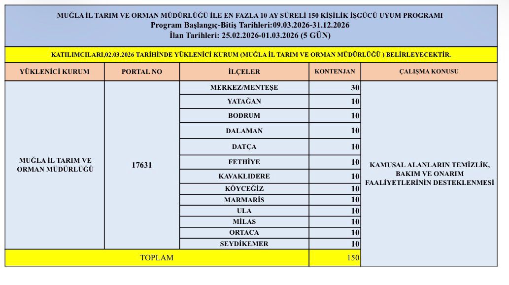 Muğla İl Tarım ve Orman Müdürlüğü ile uygulanmak üzere en fazla 10 ay süreli 150 kişilik İşgücü Uyum Programına başvuru ilan tarihleri: