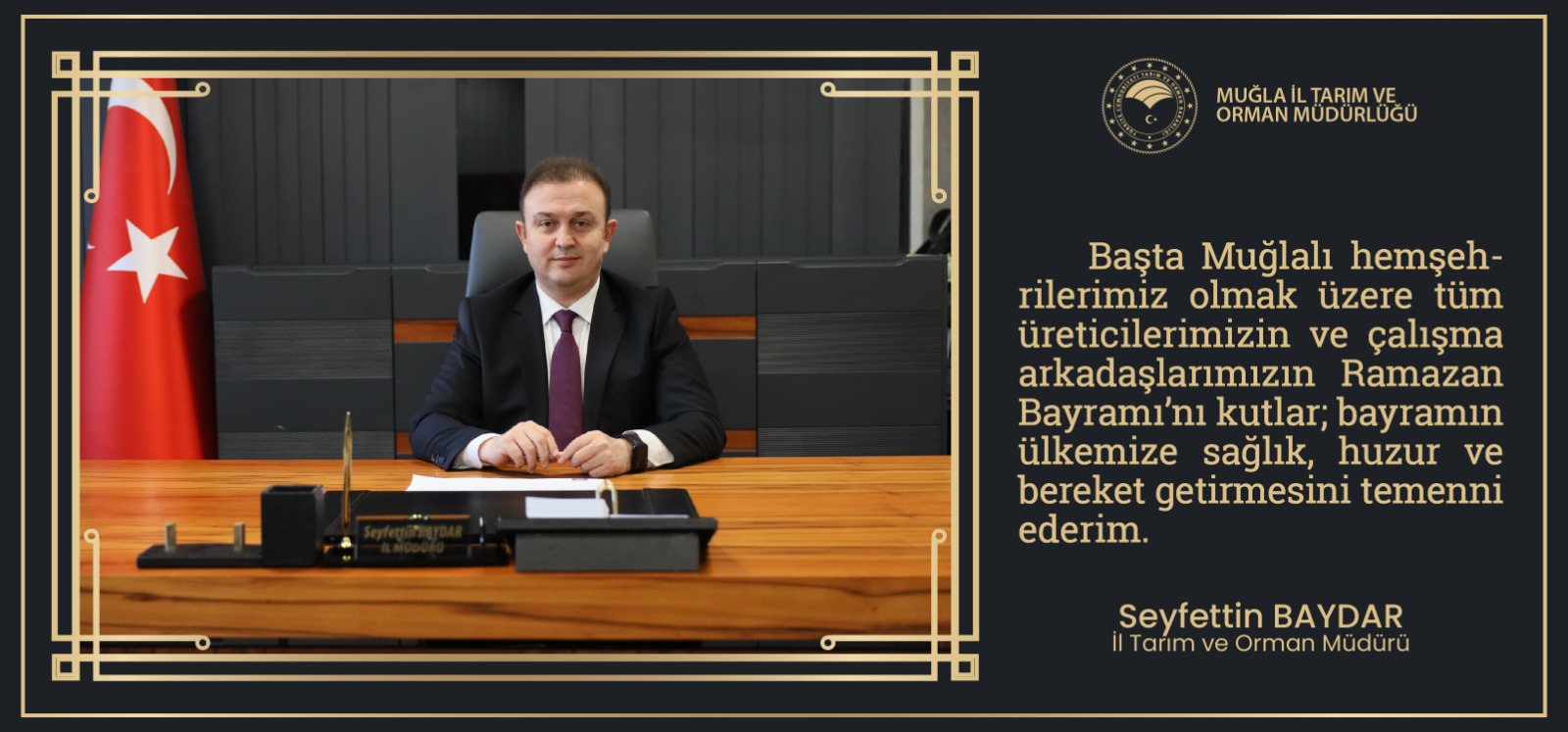 Bu vesileyle başta Muğlalı hemşehrilerimiz olmak üzere tüm üreticilerimizin ve çalışma arkadaşlarımızın Ramazan Bayramı’nı en içten dileklerimle kutluyor; bayramın ülkemize ve tüm insanlığa barış, huzur ve esenlik getirmesini temenni ediyorum.